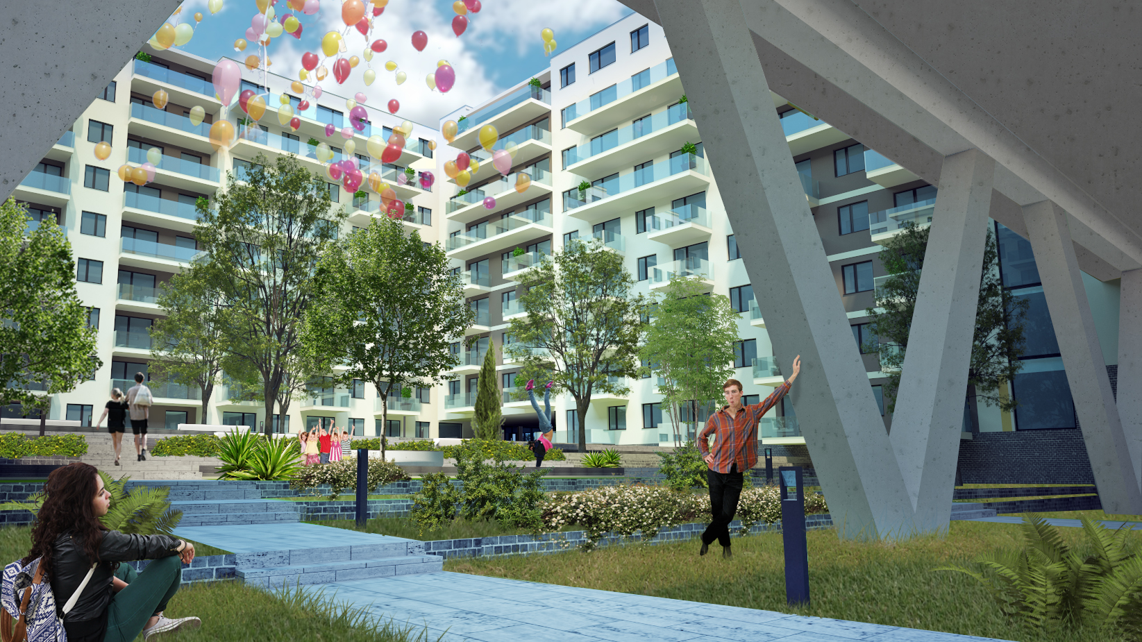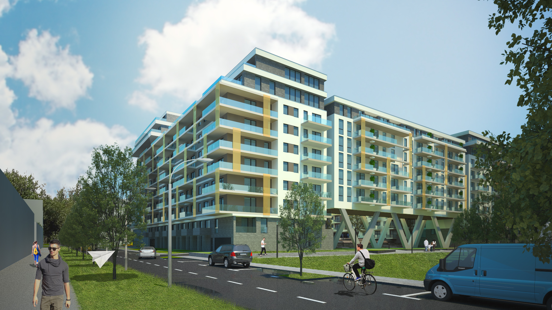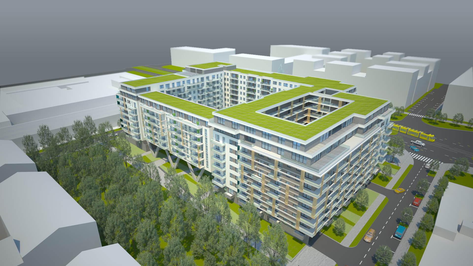 A fejlesztés célja egy két ütemben megvalósuló, korszerű társasházi lakóépület kialakítása, pinceszinti és földszinti gépjárműtárolókkal, valamint közösségi terekkel. A tervezés során elsődleges szempont volt a jól értékesíthető lakóterületek arányának növelése, mindezt a vonatkozó jogszabályok és az építtetői elvárások figyelembevételével. A magas beépítettség ellenére élhető lakókörnyezetet hoztunk létre: a tagolt tömegek között összefüggő, nagy zöldfelületű udvarrendszer alakul ki, amely minőségi rekreációs teret biztosít a lakóknak. A környék városszerkezeti logikájához igazodva a beépítés keretes karaktert mutat, a homlokzatok vertikális tagolása pedig oldja a hosszabb falszakaszok léptékét. A fő megközelítés mindkét ütemben a Cserhalom utca felől történik, ahol az első ütem visszahúzott tömege, a második ütemben pedig a széles zöldsáv jelöli ki az épület bejáratát. A lakóterek kialakításánál jól működő alaprajzi rendszert alkalmaztunk, különböző méretű, jól tájolt lakásokkal, a felső szinteken nagyméretű teraszokkal. A fiatalos, dinamikus homlokzati megjelenést üvegkorlátos erkélyek és terpesztett lemezmezők határozzák meg, amelyek egyszerre biztosítanak karakteres építészeti képet és megfelelő árnyékolást, intimitást. Az épület így modern, városi léptékű, mégis barátságos lakókörnyezetet hoz létre a Duna-part közvetlen közelében.